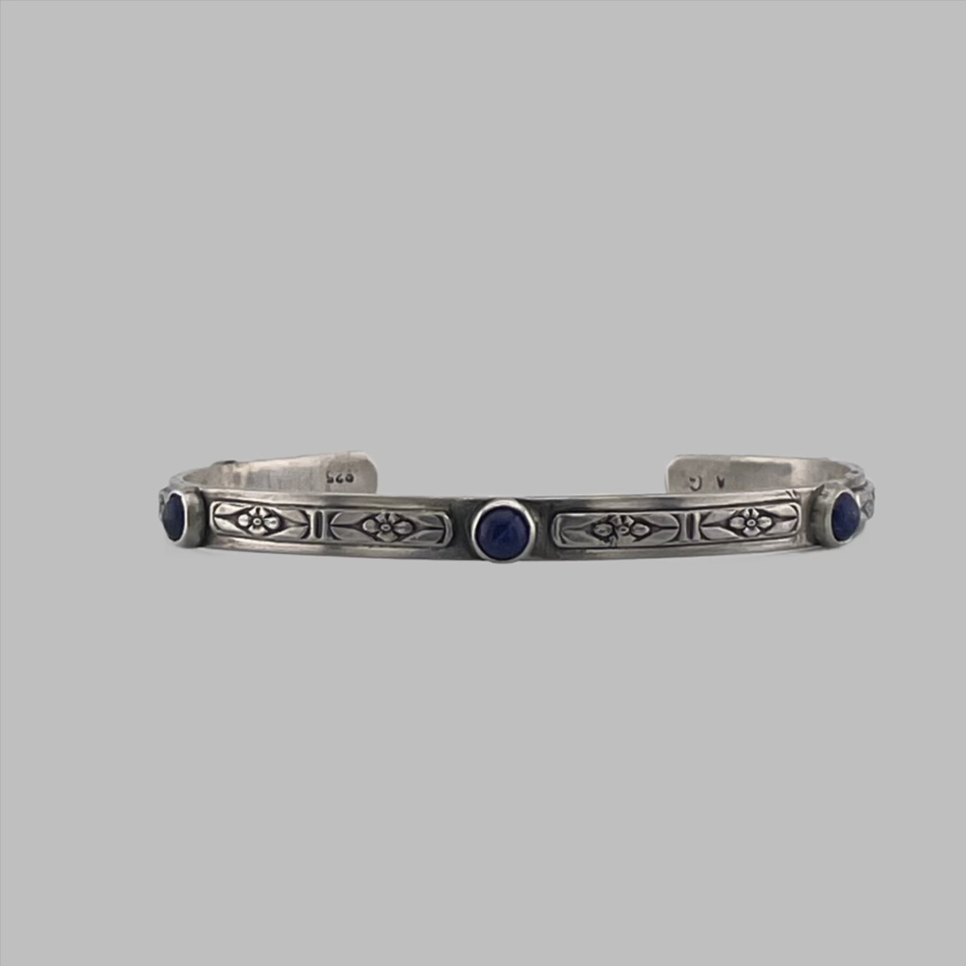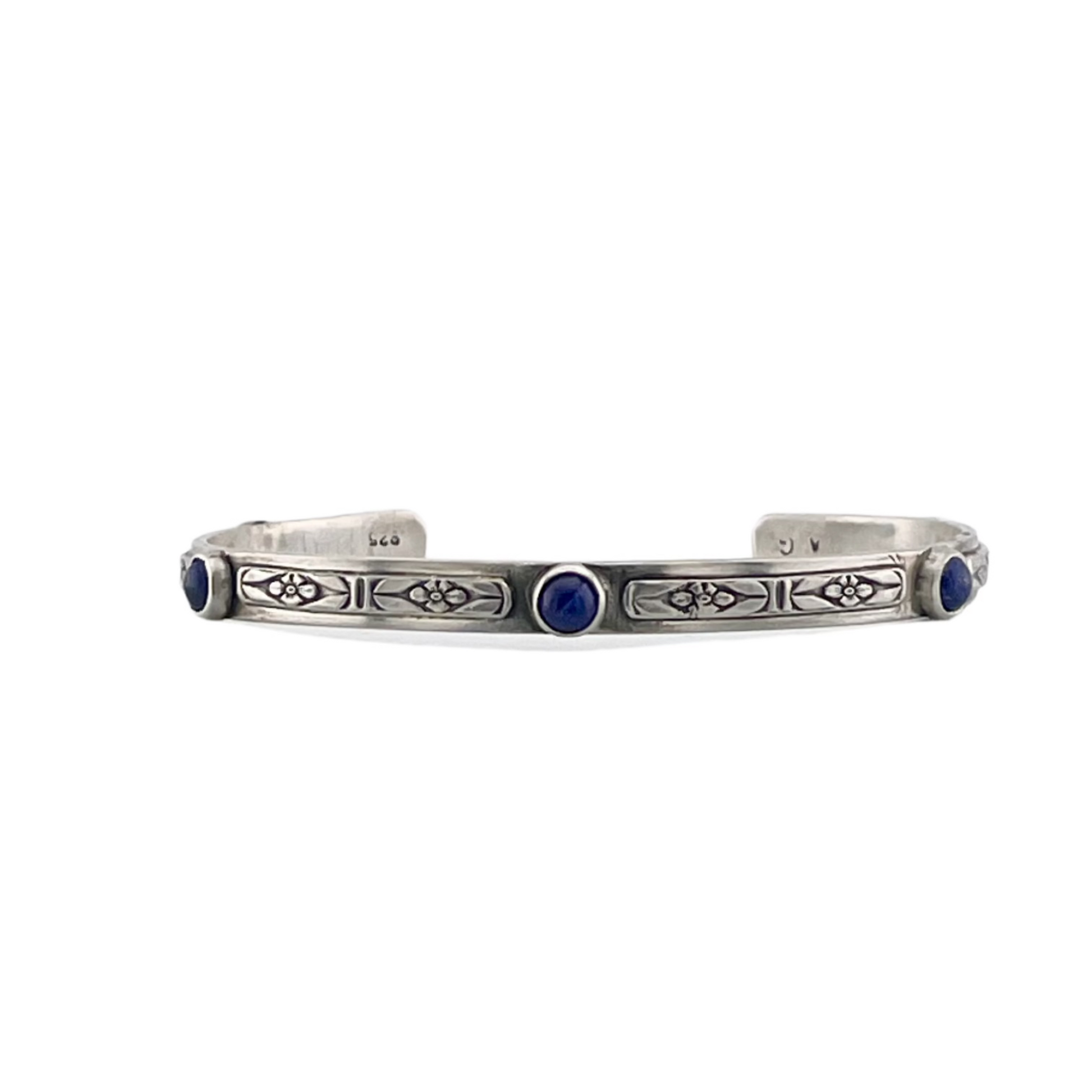 This sterling silver cuff has pretty southwest influenced decoration and is set with five small royal blue Lapis Lazuli gemstones. It is 5 mm wide and the inner diameter of the silver is 5 1/2 inches with 1 1/4 inch opening--combines to 6 3/4 inches. I will ship within 1-3 business days.