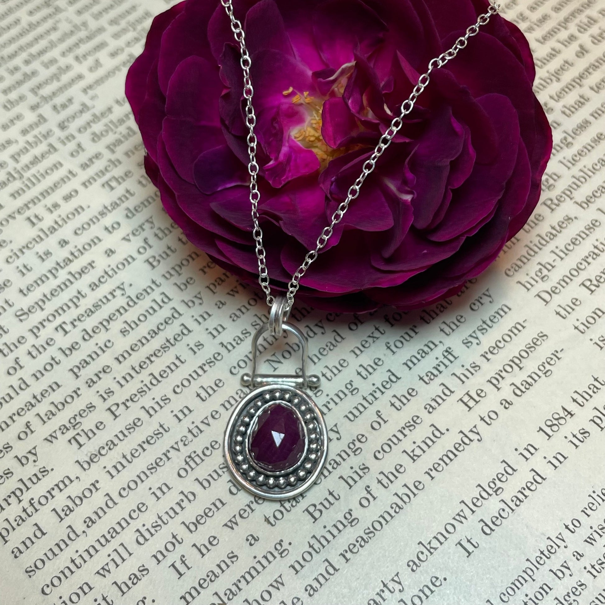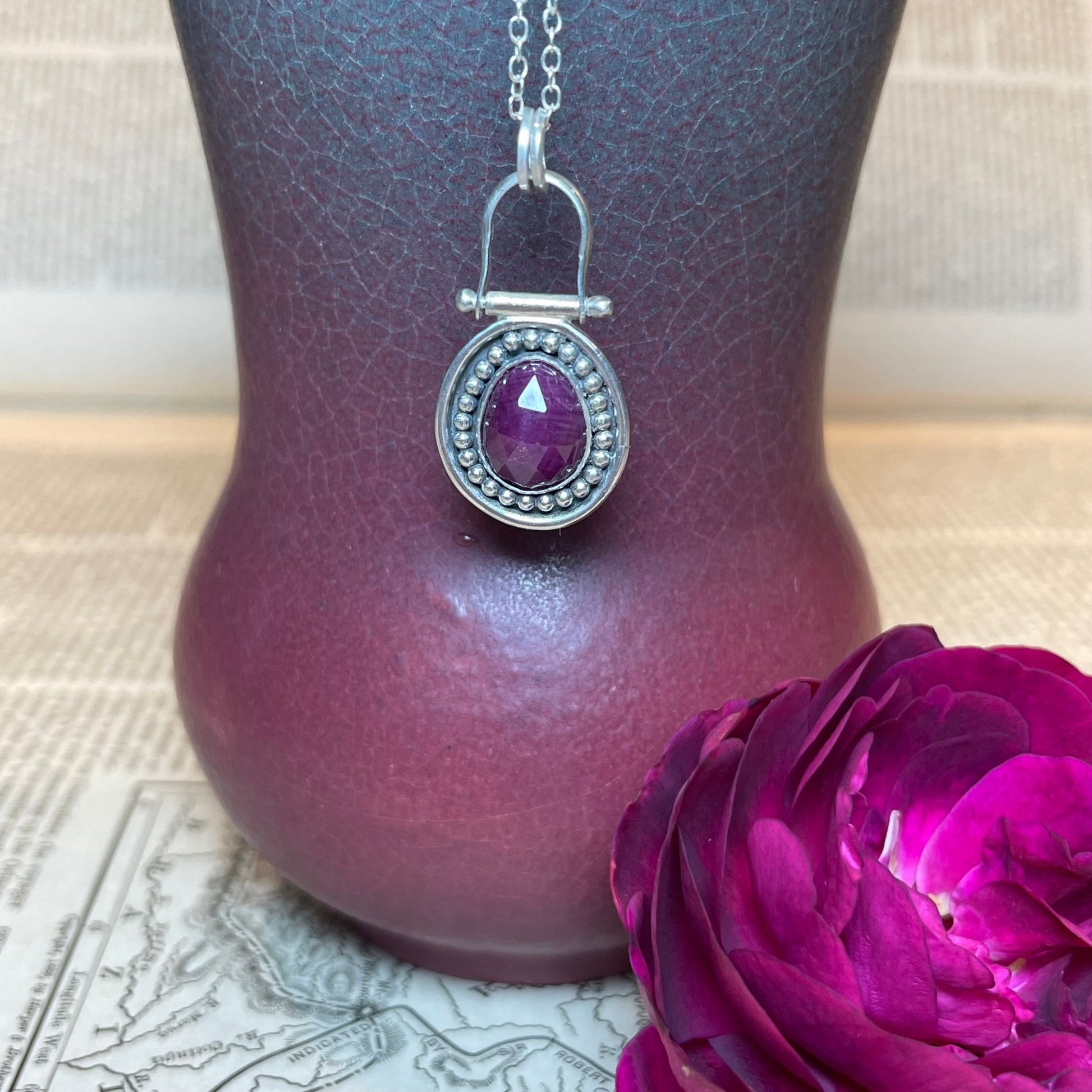 This natural rose-cut faceted ruby is set in a sterling silver beaded setting which hangs from a unique stirrup bale. The pendant measures 1" x 5/8" including the bale. A delicate 18 inch 1.3 mm cable chain is included. I will ship in 1-3 business days
