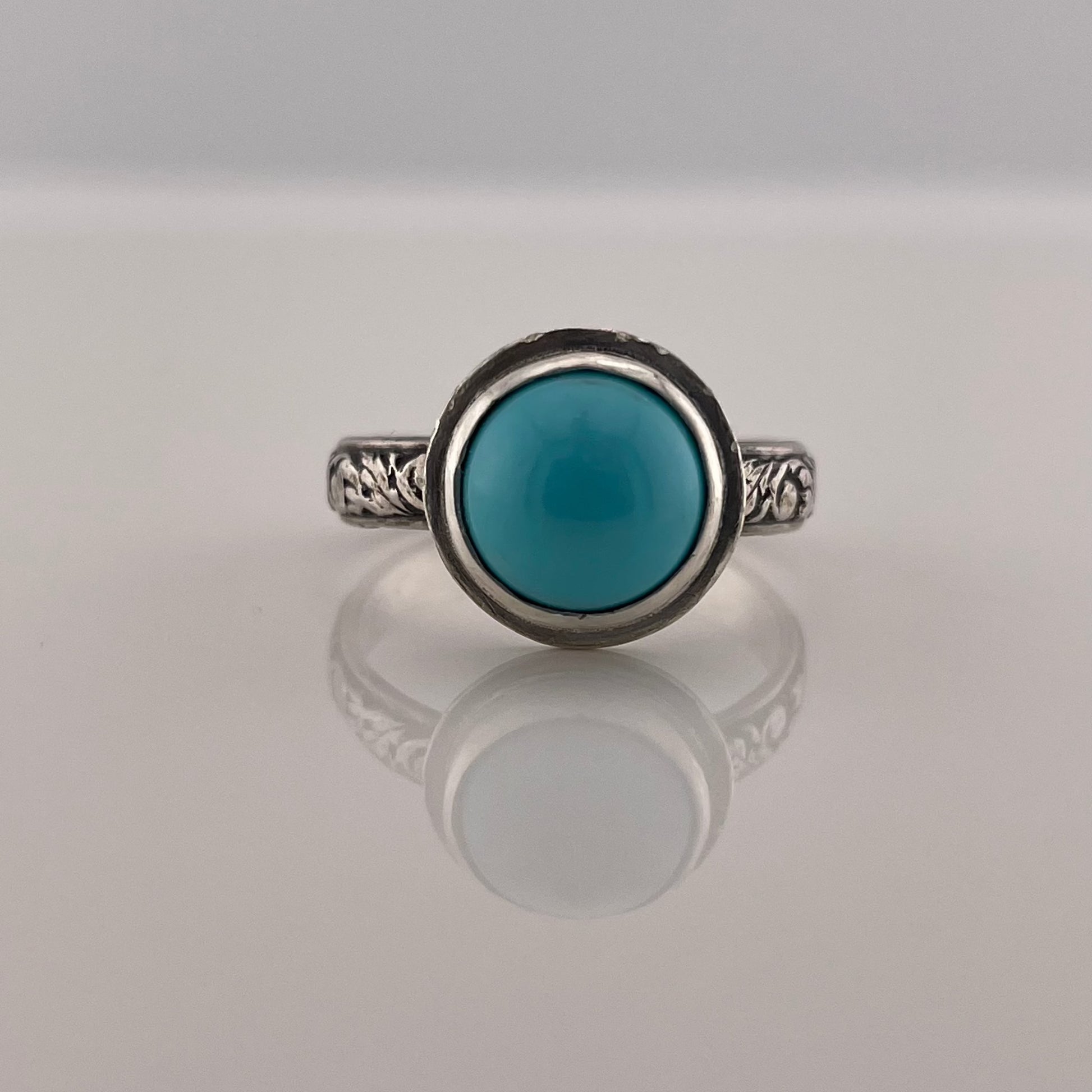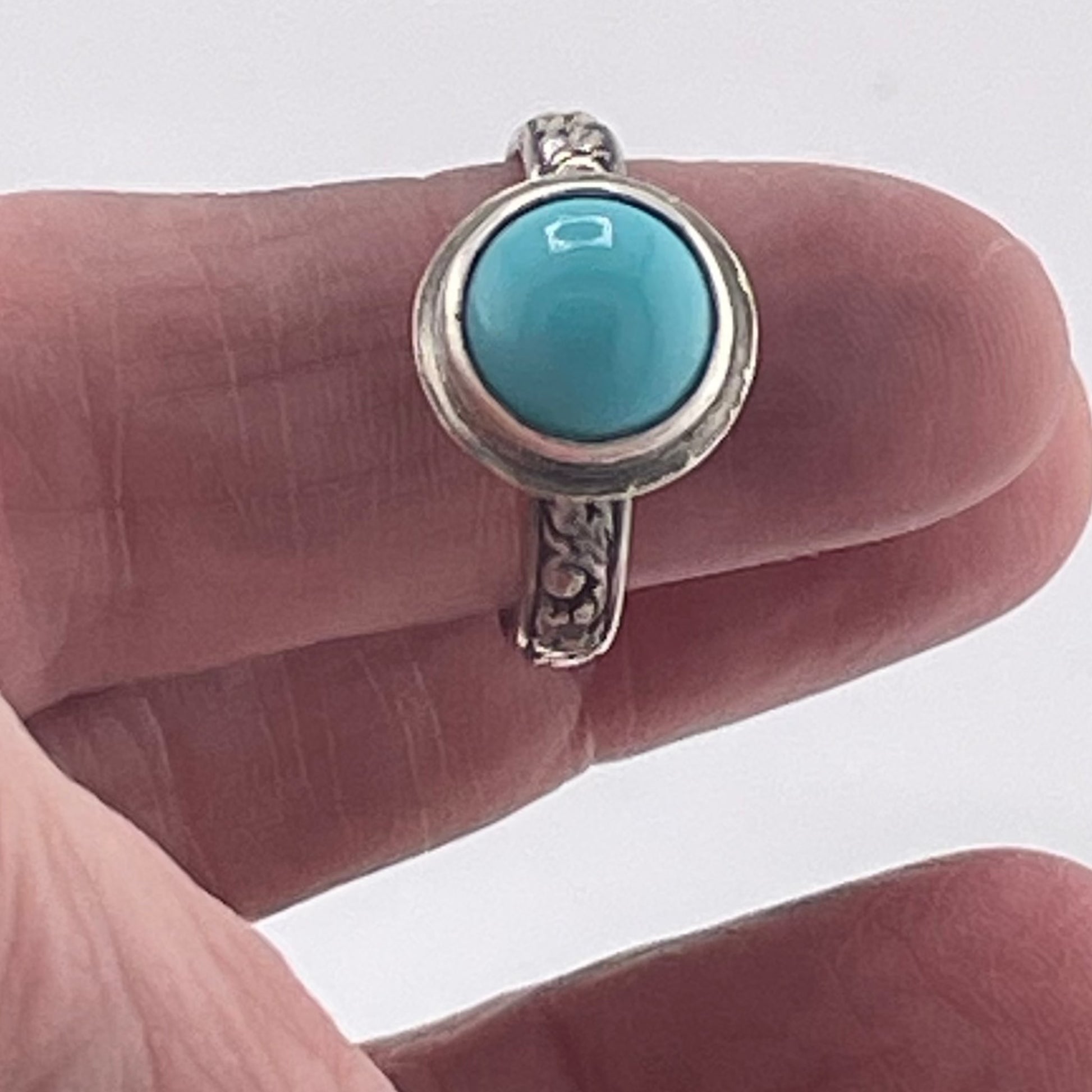 This sterling silver ring is set with a classic translucent robin's egg blue Sonora Turquoise. The band decorative floral-themed band is 4 mm wide. It is a size 6 and unfortunately cannot be resized. The setting is just under 1/2 inch across. I will ship in 1-3 business days.