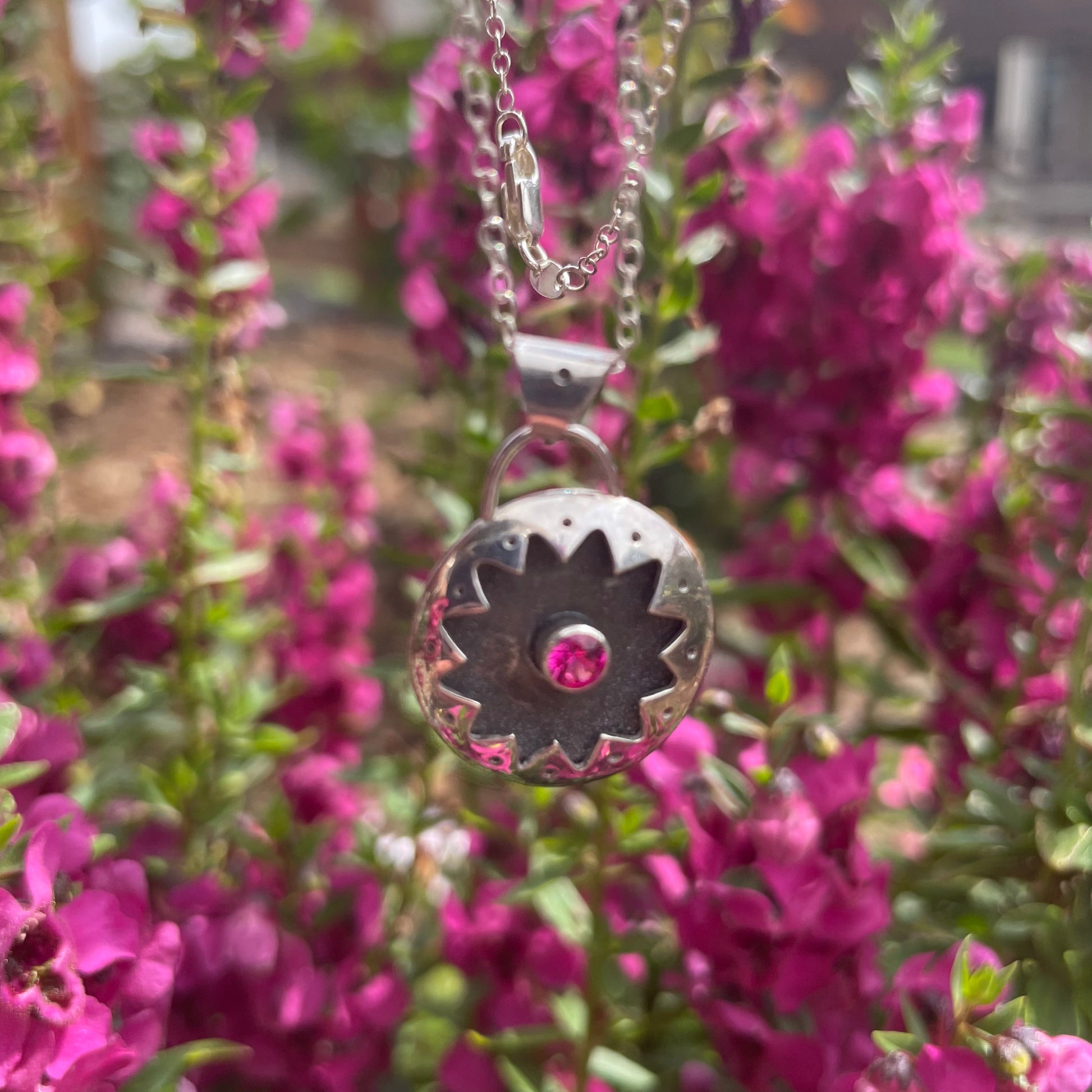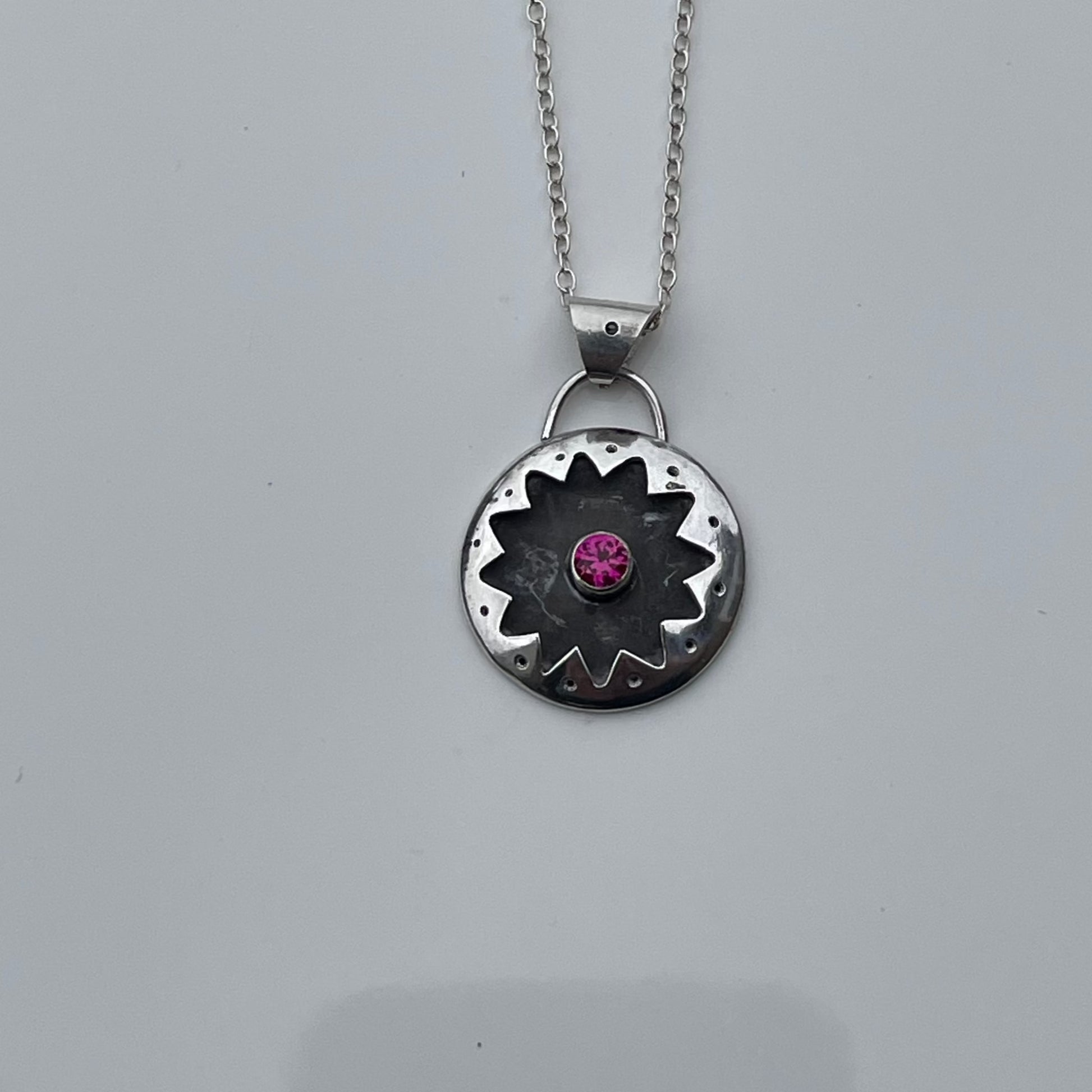This sterling silver starburst necklace is set with a lab-grown ruby and is hand sawn and forged. The pendant measures 3/4 inch across and comes with a delicate 18 inch 1/3 mm cable chain. It ships in 1-3 business days.
