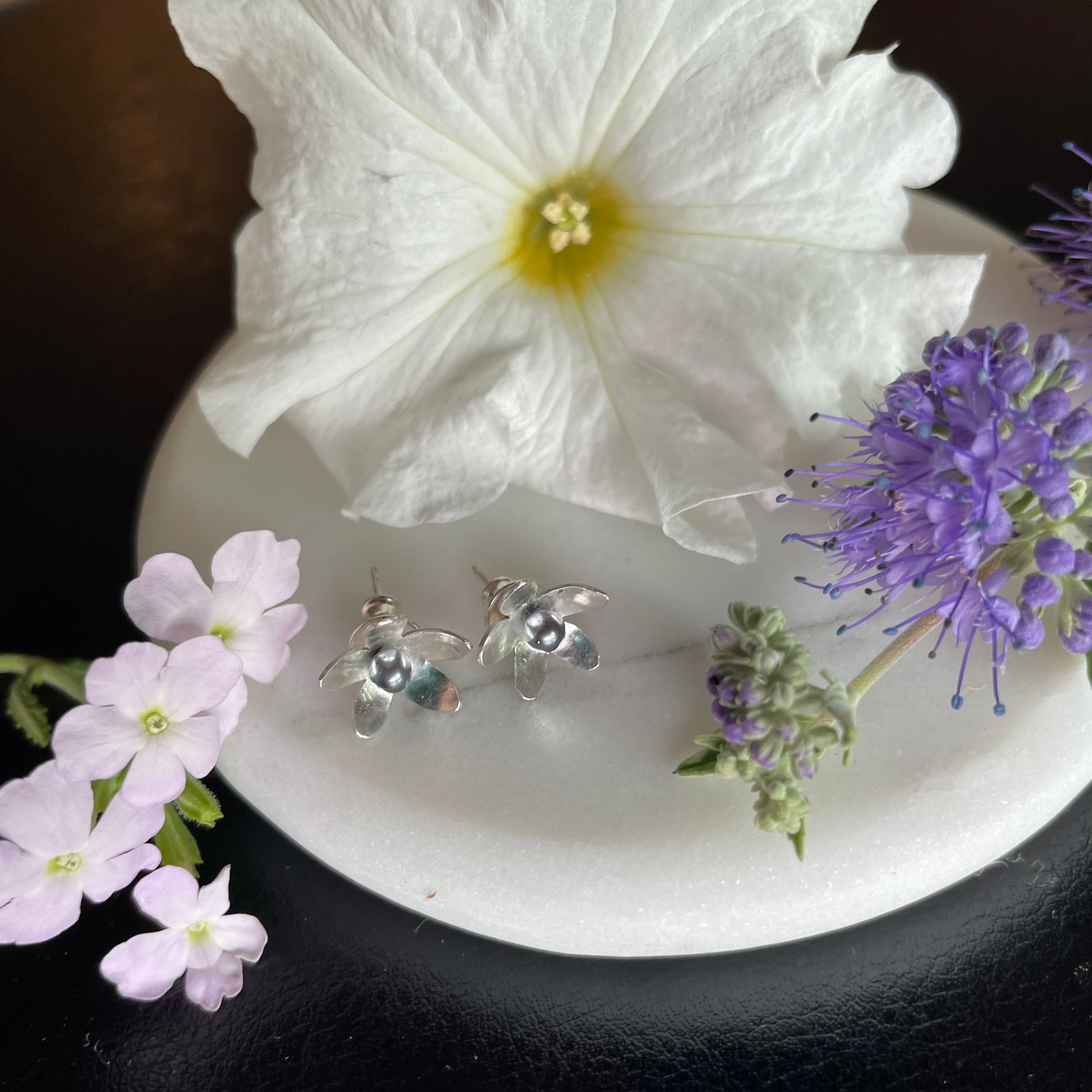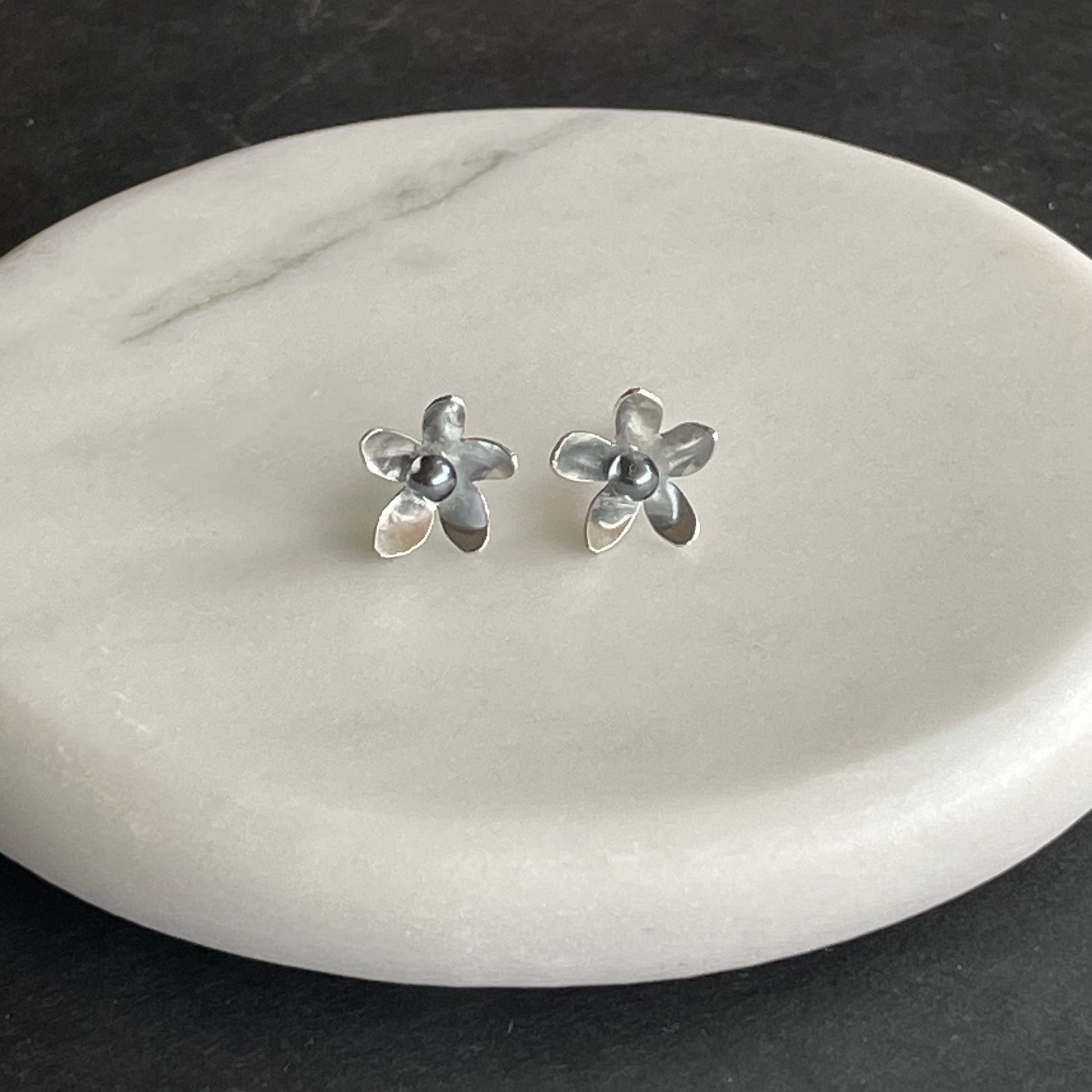 These unique little hand cut delicate sterling flowers are set with tiny freshwater black pearls and are lightweight and comfortable. They come in a recyclable gift box and usually ship within 1-3 business days.