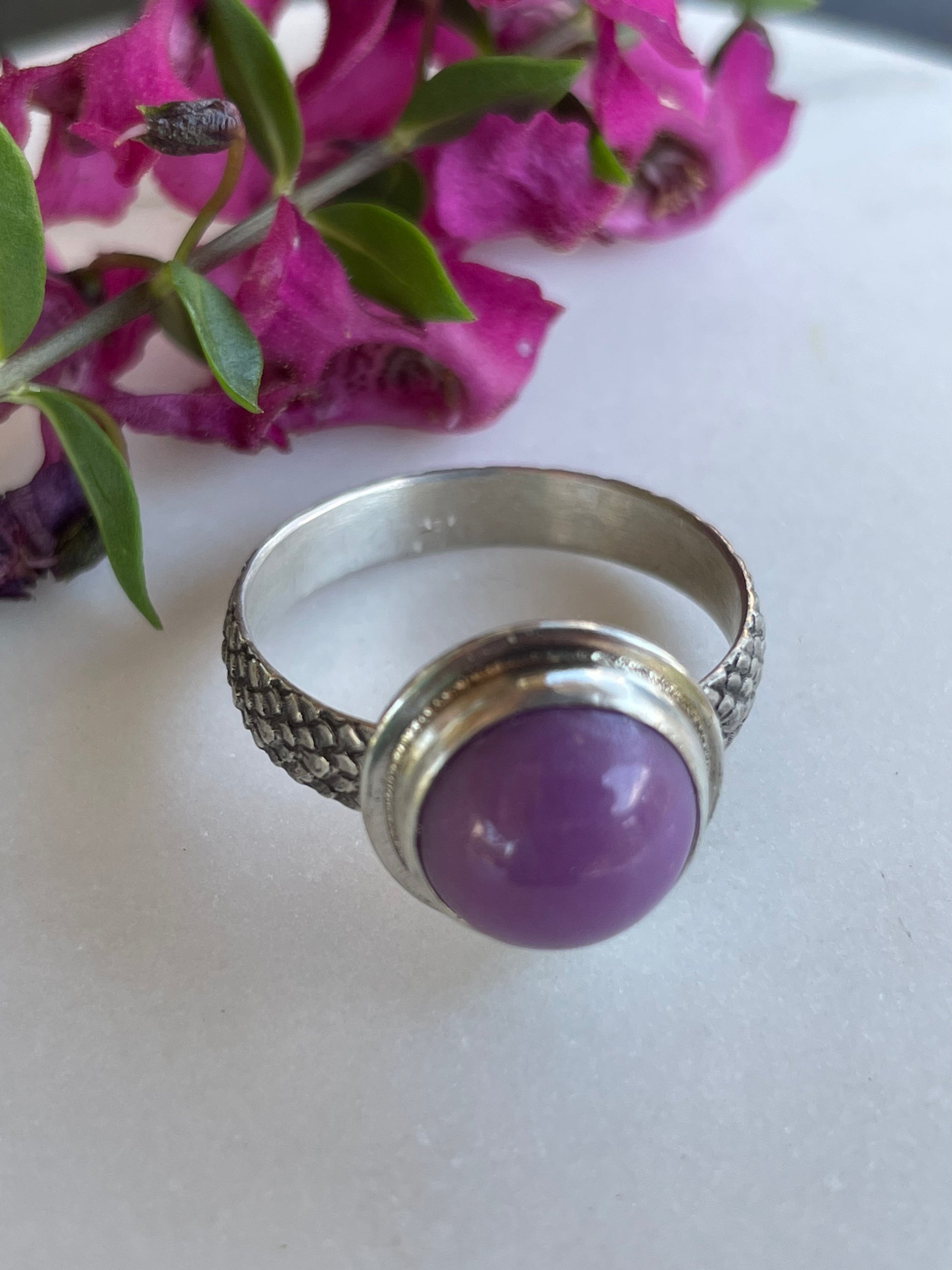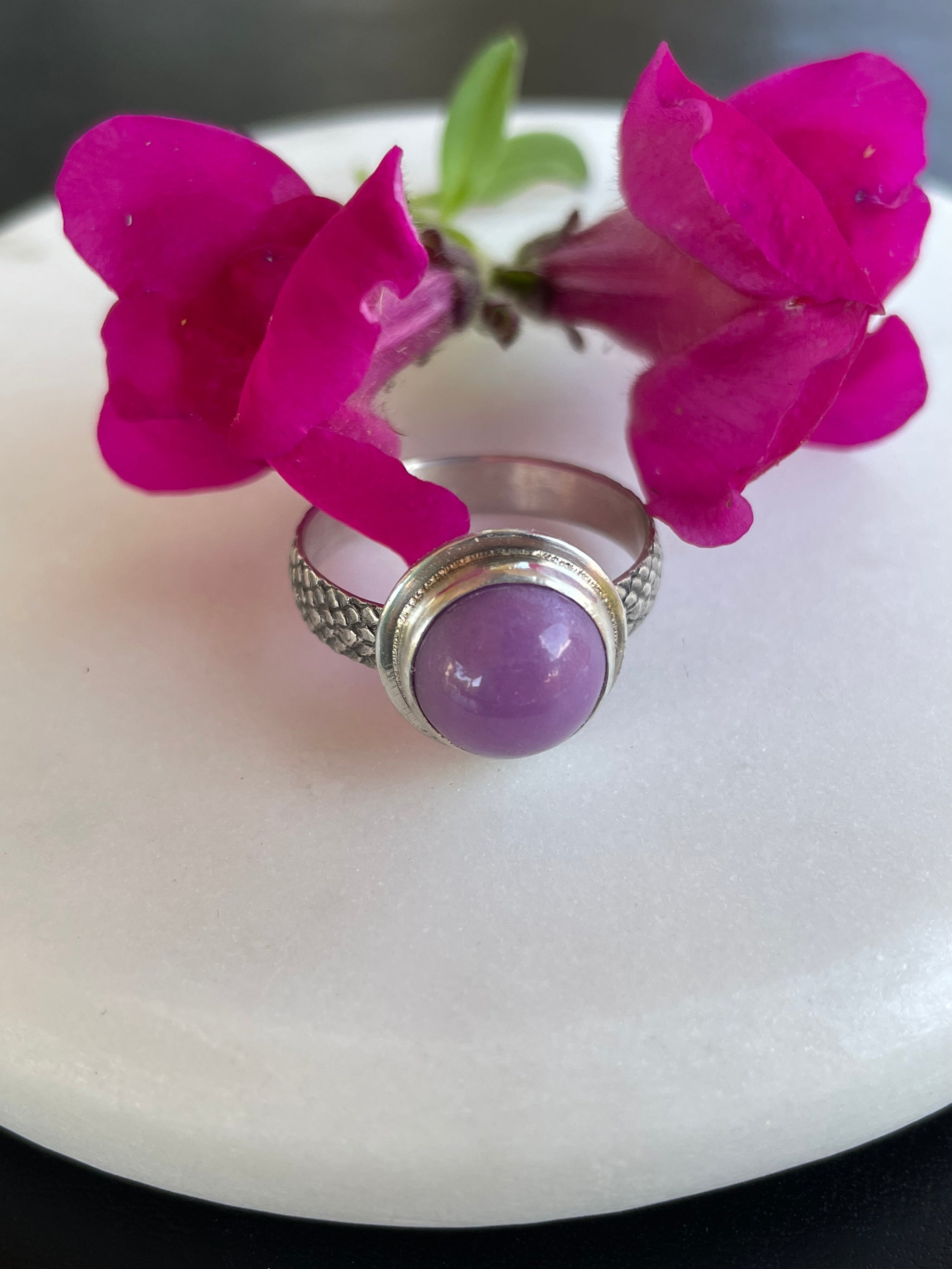 This striking sterling silver ring is set with a rare orchid-purple AAA Grade Phosphosiderite from Peru. The snakeskin pattern band is 4 mm wide. It is size 8.25 to 8.5 and cannot be resized. The stone and setting are 1/2" across. I will ship in 1-3 business days.