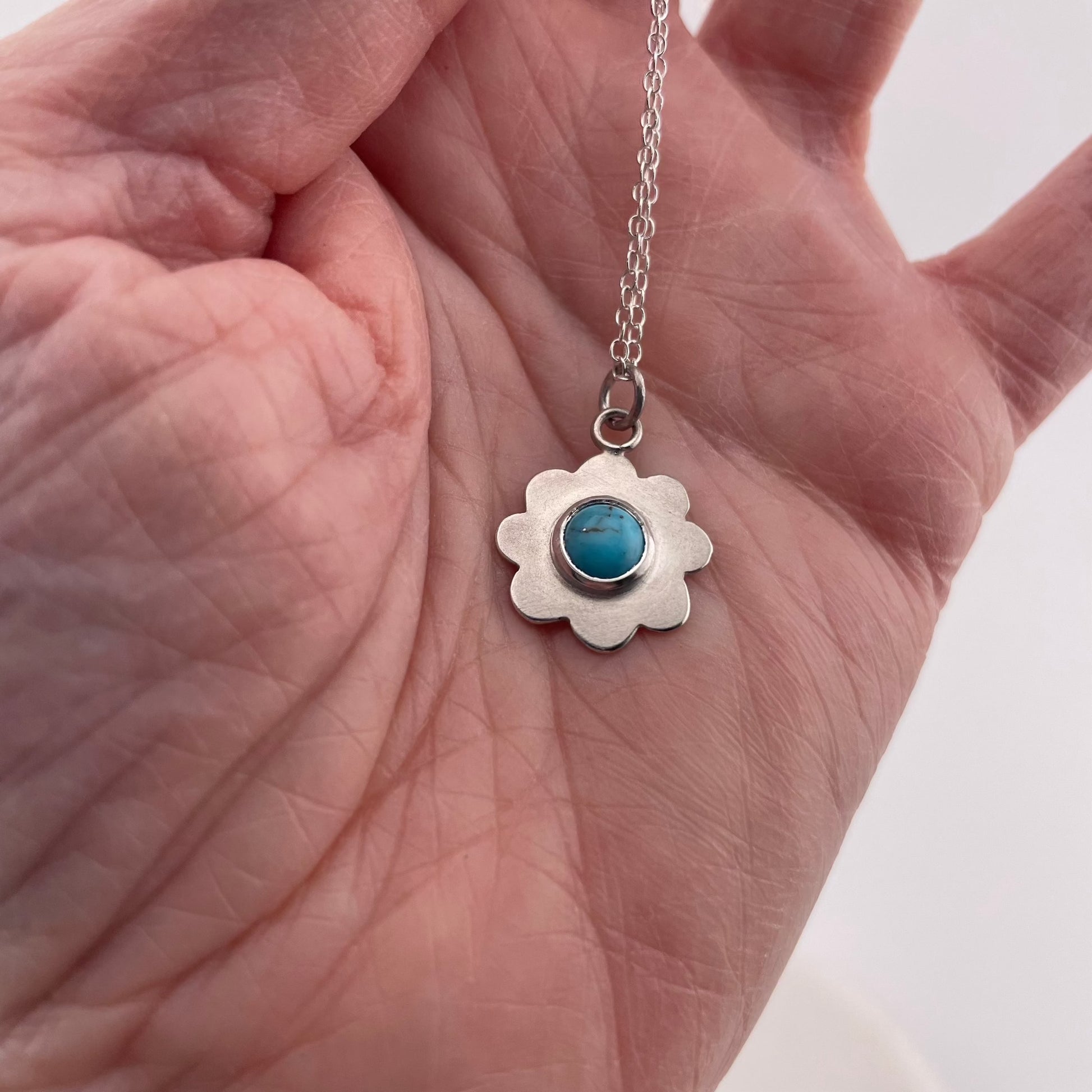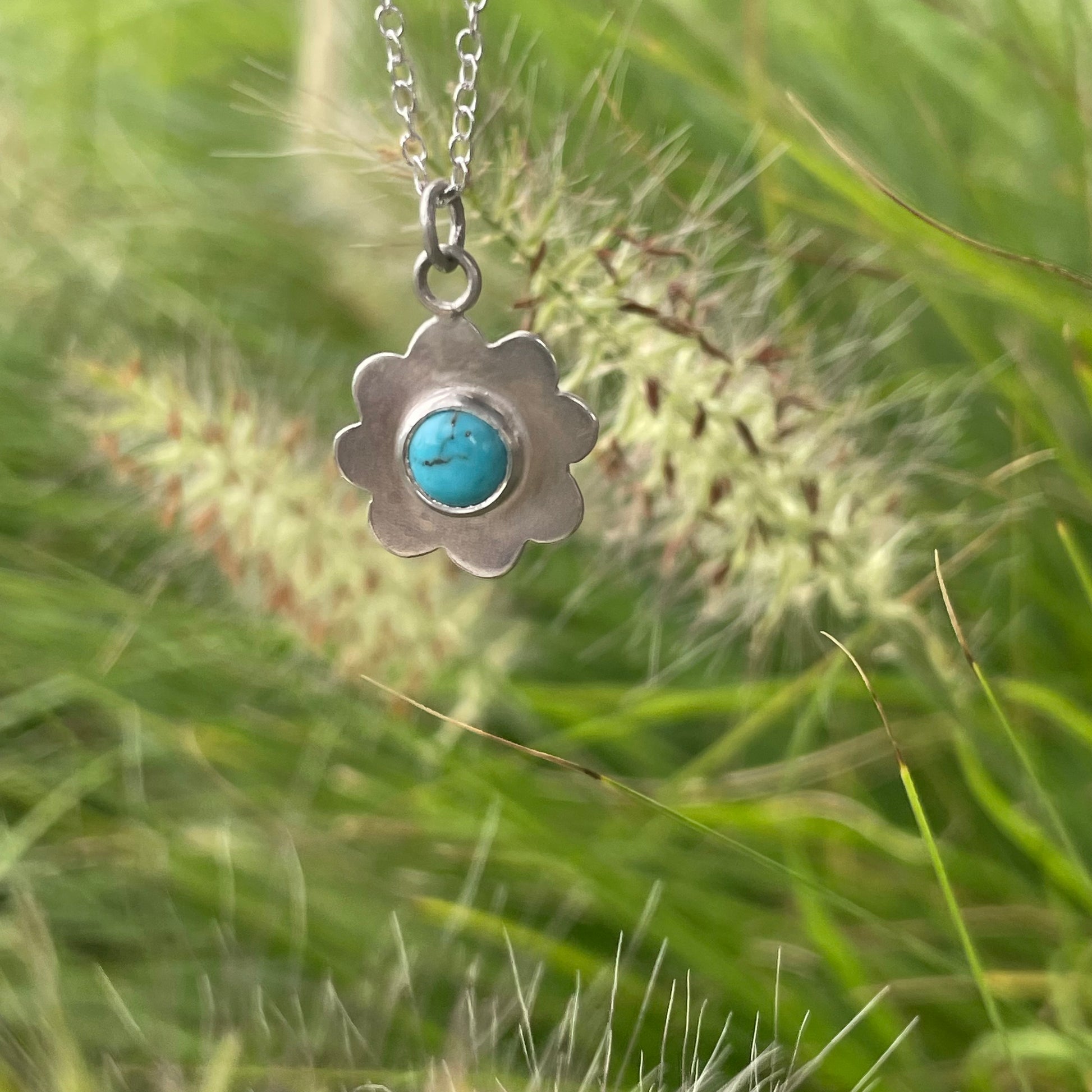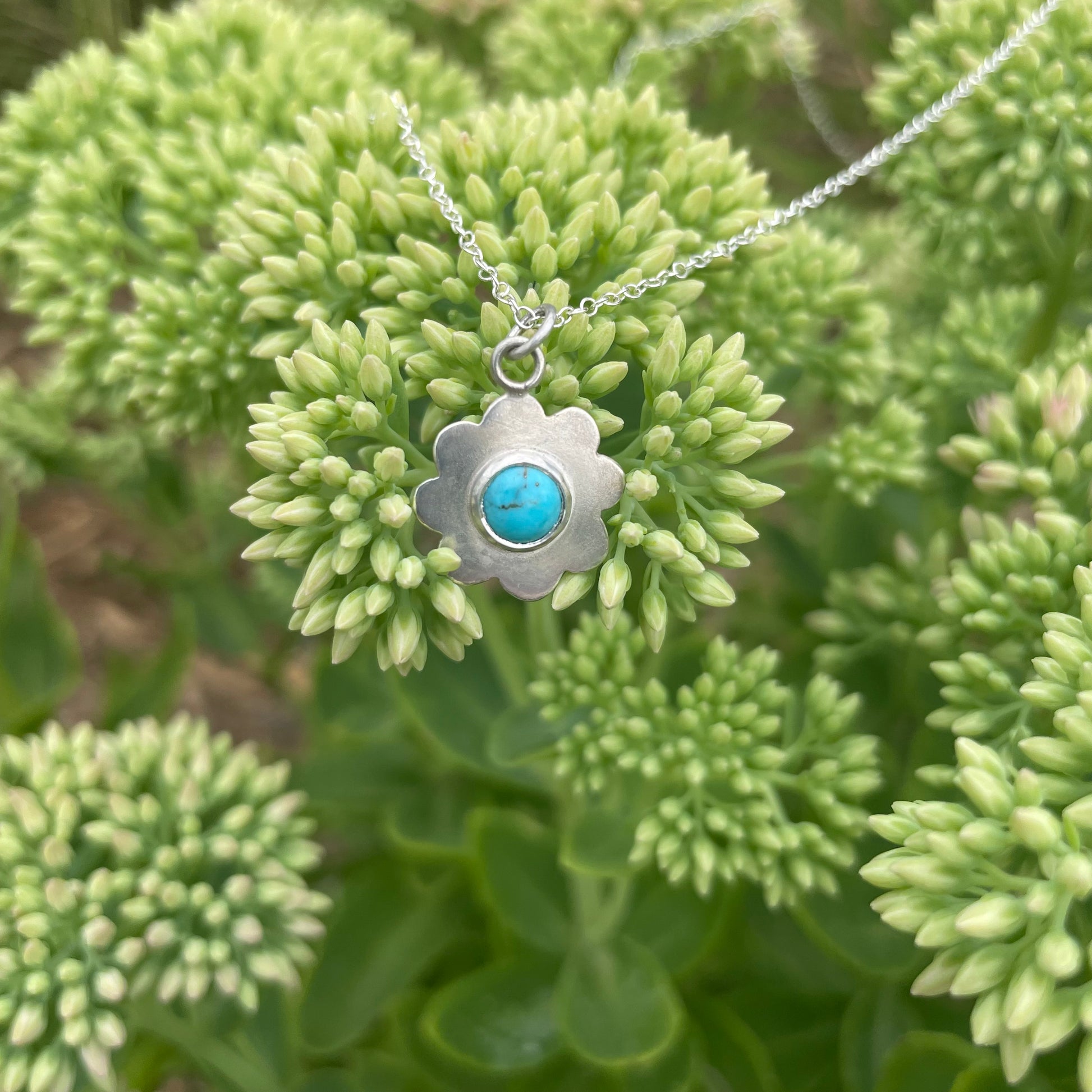 My new everyday necklace! This American-mined Kingman turquoise from Arizona is a classic robins-egg blue with minimal delicate matrix. It is simply pretty--set in a hand cut and shaped brushed sterling silver setting, hand-buffed to a gentle glow. The pendant measures about 15 mm across and comes with an 18 inch 1.3 mm delicate cable chain. I will ship in 1-3 business days.